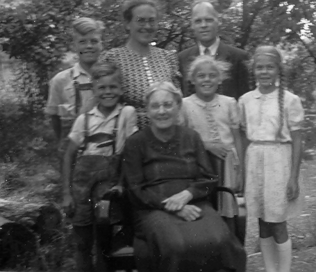 | Julie Brickelei Hausen 1949 Julie Merkel, geb. Keller, in Hausen bei Gretel und Wilhelm Brick mit 4Kinder