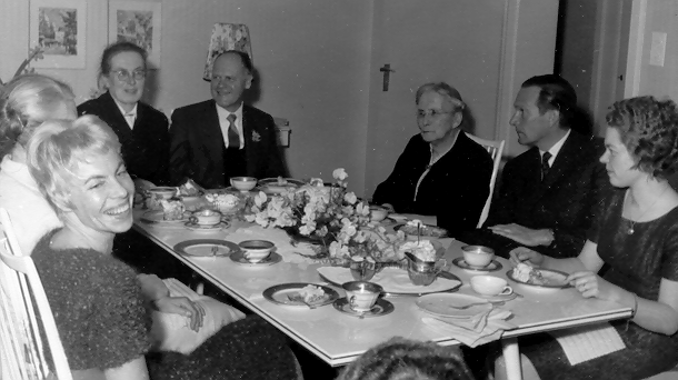 | Julie bei Gretels Silberhochzeit Julie Merkel, geb. Keller bei der Silberhochzeit ihrer Tochter Gretelmit Wilhelm Brick in Stuttgart Vaihingen bei Wolf Merkel mit Frau Ruth,Christel und Bärbel