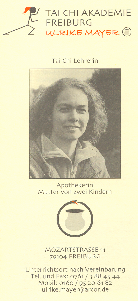 | Mayer Ulrike Tai Chi Ulrike Mayer eröffnet am 28.2.1904 eine Tai Chi Akademie in Freiburg, Karlsstraße 29